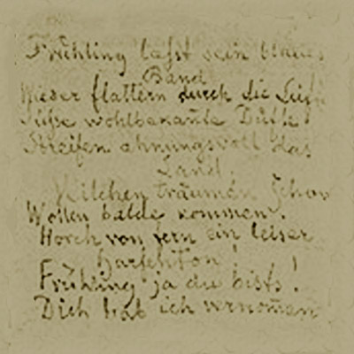 10 | Sie achtet's nicht, sie ist es müd';Ihr klingt des Himmels Bläue süßer noch,Der flücht'gen Stunden gleichgeschwungnes Joch.Doch immer behalten die Quellen das Wort,Es singen die Wasser im Schlafe noch fort |