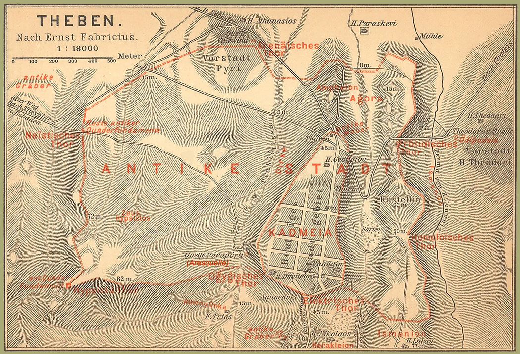 Wir gingen also von der Quelle Paraporti den in nordwestlicher Richtung nach Thespiä führenden Feldweg entlang bis zu dem Punkte, wo auf der Karte die πύλαι Nηΐσται, das niedrigste Thor“ angegeben ist. Hier hatte Prof. Fabricius schon im Jahre 1888 50m nach Norden hin die alte Stadtmauer verfolgt. Das hohe Getreide, welches das Feld bedeckt, hindert uns zwar, dies nachzuprüfen. Dafür aber finden wir auf dem Wege selbst mächtige Quadern, die zu dem Fundament des Thores und seiner Türme gehört haben müssen, und von dort genau südlich durch die Weinberge ansteigend stoßen wir auf Schritt und Tritt auf Quadern, die in der Erde stecken und, da sie eine fortlaufende Reihe bilden, nicht zu Gebäuden gehört haben können. Sie sind also Reste des Steinsockels, auf dem die Lehmziegelmauer aufsetzte. Weiter nach Süden aufwärts steigend kamen wir auf einen schmalen Grat, der nach Westen ganz steil, nach Osten allmählicher abfällt. Dieser ganze Grat nun, der selbst für ein kleines Haus keinen Raum geboten hätte, war mit den Resten von gebrannten roten und schwarzen Dachziegeln förmlich übersät. Es war klar: hier konnte nur eine Mauer gestanden haben; auf dem hohen Grat entlang laufend war sie so gut wie unangreifbar. Die Dachziegel waren von der mehr und mehr zerfallenden Luftziegelmauer, die mit ihnen abgedeckt war, herabgespült worden und durchsetzten nun mit ihren Scherben den Boden. Hier war es auch, wo Herr Kalopäs hatte graben lassen, und wir überzeugten uns nun auch durch den Augenschein von der Existenz der mächtigen Quadern des Steinsockels. Dann bildet die Mauer, den einzelnen hügeligen Erhebungen folgend, eine mehrfach gebrocheue Linie und läuft an dem südwestlichsten Punkt des Stadtgebiets in eine Spitze aus, wo ein in seinen Fundamenten erhaltener Turm das höchste der sieben Thore, die πύλαι ὕψισται, flankierte.Von hier aus läuft die Mauer ziemlich genau nach Osten den Berg hinab, um sich oberhalb der Paraportiquelle an die Südmauer der Kadmea anzuschließen. Hier, beim Übergang über die Dirke, muß das Ogygische Thor gelegen haben; denn dieses hieß auch das Onkäische, und der heilige Bezirk der Athena Onka muß in der Kirche der Hagia Trias wiedererkannt werden, die etwas oberhalb am linken Ufer der Dirke liegt. Hier war nach des Äschylos Sieben gegen Theben“ Hippomedon aufgestellt, und Eteokles spricht die Hoffnung aus, daß die Ὄγκα Παλλὰς ἥ δ᾽ ἀγχίπτολις seinen Übermut schon bändigen werde.Die Stelle der andern Thore, außer dem oben genannten Elektrischen, welches bei Äschylos Kapaneus bedroht, konnten wir leider nicht mehr aufsuchen. Doch möge in Kürze der weitere Verlauf der Mauer samt den Thoren zur Vervollständigung angegeben werden.Vom Elektrischen Thor ausgehend schloß die Stadtmauer eine von Süd nach Nord laufende Reihe von kleineren Hügeln ein und beherrschte in ihrer ganzen Ausdehnung auf dieser Seite das steilabfallende linke Ufer des Ismenos. Diese Strecke war von zwei Thoren unterbrochen. Auf dem Wege nach Chalkis öffnete sich das Proitidische Thor, vor dem bei Aschylos Tydeus steht; er wagt jedoch nicht, den Ismenos zu überschreiten, weil die Opfer nicht günstig ausgefallen waren. Südlich davon zwischen dem Proitidischen und Elektrischen Thor ist das Homoloïdische Thor anzusetzen, das bei Äschylos Amphiaraos bestürmt; es hat seinen Namen von einem Tempel des Zeus Homoloïos. Es bleibt somit nur noch ein Thor übrig, welches auf der Nordseite gelegen haben muß, das Borrhäische bei Äschylos, wo Parthenopaios stand. Es wird wie das Ogygische im Süden, so hier im Norden in der von der Dirke durchflossenen Senkung gelegen haben. Es hieß auch das Krenäische, das Brunnenthor, und noch jetzt sprudeln dort in der Nähe in der Vorstadt Pyri, wie wir uns später im Vorüberfahren überzeugten, zwei prächtige Brunnen, die Chlévina links und die Wránesi rechts der Straße. Von dort aus bis zu dem Neïstischen Thore im Nordwestem wo wir unsre Wanderung um die Mauer begannen, kann, was bei dem ziemlich flachen Gelände und der dadurch ermöglichten Bebauung des Bodens leicht erklärlich ist, der Lauf der Mauer nur vermutungsweise angesetzt werden.Betrachtet man den so sich ergebenden Umfang der Stadt, ein unregelmäßiges Viereck von durchschnittlich etwa 1600m Länge und 1100m Breite, so könnten Zweifel entstehen, ob ein so gewaltiges Areal für Theben selbst zur Zeit seiner höchsten Blüte nicht zu umfangreich gewesen sei. Zur Zeit ihrer Zerstörung durch Alexander hatte es 40000 Einwohner. Aber man muß erwägen, daß Theben alten Nachrichten zufolge mehr Gartenanlagen enthielt als irgend eine andre Stadt, und dies führt uns auf die richtige Lösung der Frage. Namentlich der westliche Mauerring schließt, wie wir uns bei unserm Umgang überzeugt hatten, stellenweise so steiles Terrain ein, daß von Häuseranlagen auf demselben keine Rede sein konnte. Es mußte dasselbe jedoch wie bei jenem beiderseits abschüssigen Grat in die Mauer mit einbezogen werden, damit diese die beste fortifikatorische Lage erhalten konnte. Die Verteidigungsfähigkeit allein war für den Zug der Mauern maßgebend, und bei der geringen technischen Vollendung der Belagerungskunst genügte es vollständig, an solchen Stellen die Mauer mit einzelnen Posten zu besetzen, um sie vor heimlicher Ersteigung zu sichern. Zudem konnte der Einschluß von Feldern und Gartenland im Falle einer längern Belagerung für den Unterhalt der Belagerten von großem Werte sein.Übrigens hatte uns schon im Peloponnes, in Mantinea, der bedeutende Umfang des Ovals überrascht, den der fast überall gut erhaltene Steinsockel der Luftziegelmauer bildete, und in Messene war es uns wie jetzt in Theben aufgefallen, welche für den Häuserbau völlig unbrauchbare Strecken die eng der Gunst des Geländes sich anschließende Mauer einschloß. In Ephesus läuft, wie wir später sahen, die von Lysimachos, dem Feldherrn Alexan