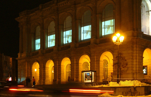 dann auf der gesamten Fassadenfront des Theaters eine große virtuelle Party feierten.